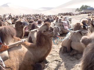 鳴沙山のラクダ 二日目は、西安の大雁塔を観てから敦煌へ飛行機で移動。鳴沙山の砂漠に行って、初めてラクダに乗った。ごわごわした毛···